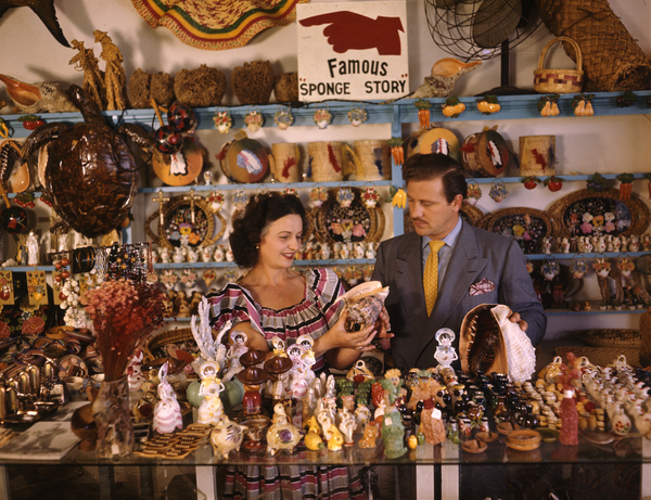 John M. Gonatos in his curio shop with assistant Niki Vasilikis: Tarpon Springs, Florida, 1942