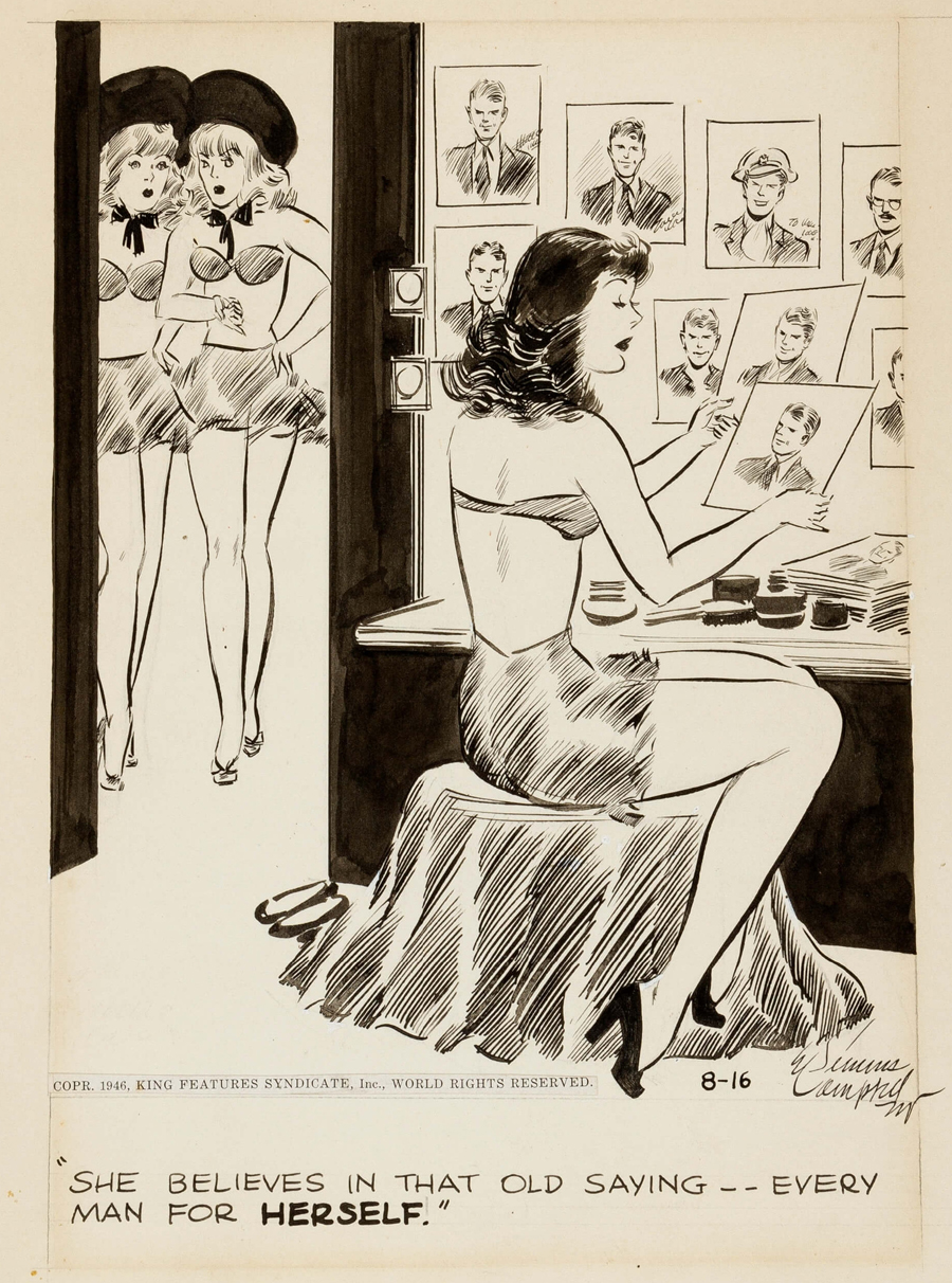 Following the suggestion of cartoonist Russell Patterson to focus on the hyper-sexualised version of femininity depicted in comics of the era known as good girl art, Campbell created his Harem Girls, a series of watercolour cartoons that attracted attention in the first issue of Esquire, debuting in 1933. Campbell’s artwork was in almost every issue of Esquire from 1933 to 1958 and he was the creator of Esky, its mascot – the cartoon character in a silk top hat.