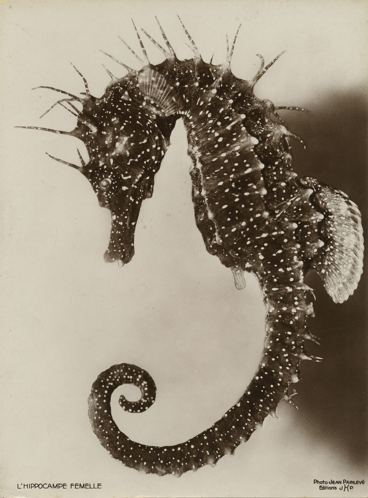 Financed in part by a personal loan from Bernard Natan, who then distributed it through the Pathé-Consortium, “The Seahorse” was a popular success — the first and only of Painlevé’s films to break even. Indeed, so popular was the film that Painlevé launched a line of seahorse jewelry: gilded bracelets, necklaces, pins, and earrings that were designed by Geneviève Hamon, sold under the label “JHP” (for Jean Hippocampe Painlevé) and displayed in chic boutiques alongside aquariums filled with live seahorses. Promotional photographs were shot by Philippe Halsman, the Lithuanian-born photographer whose work is collected today in such books as “Dali’s Moustache” and “The Jump Book.”