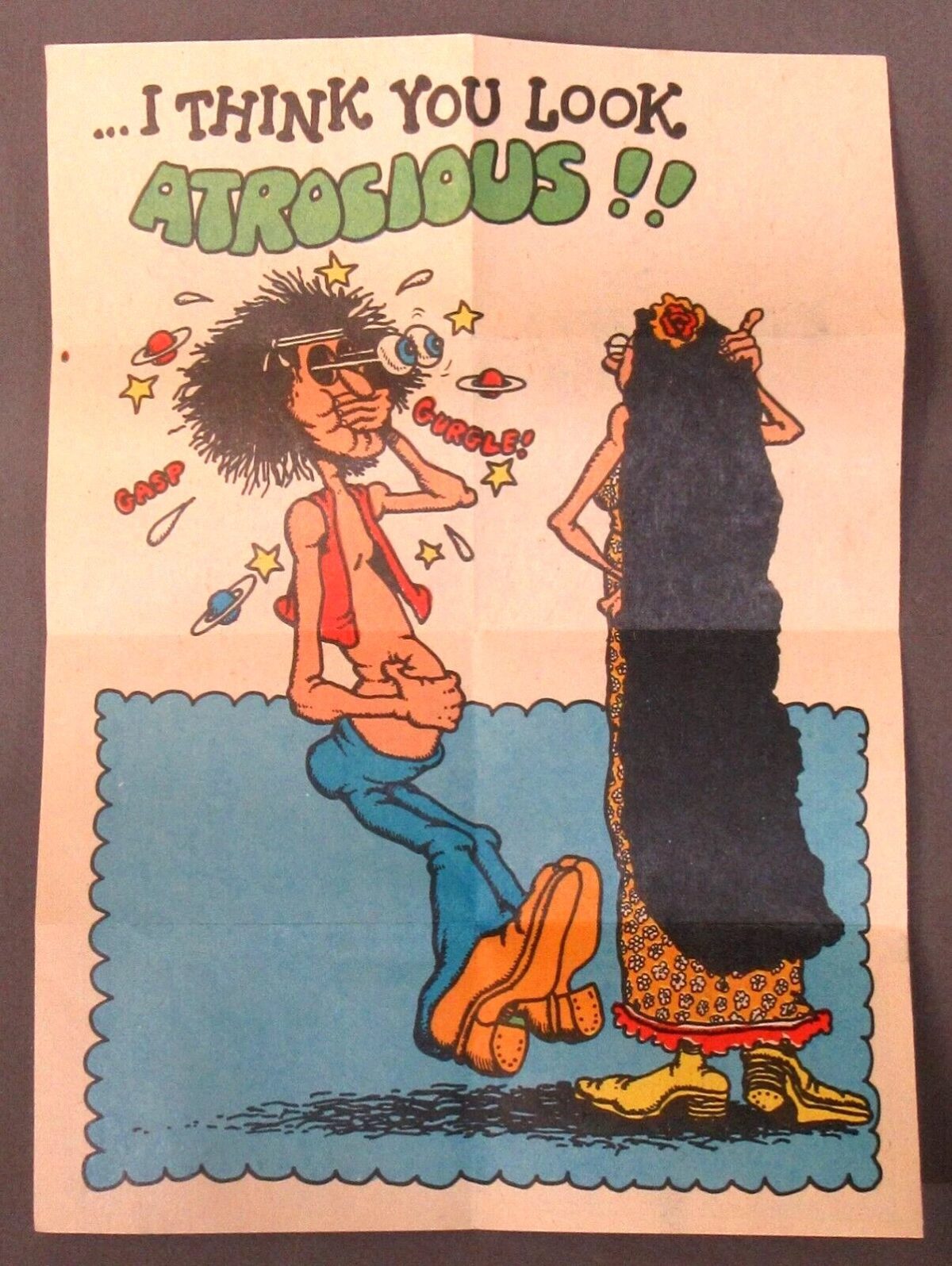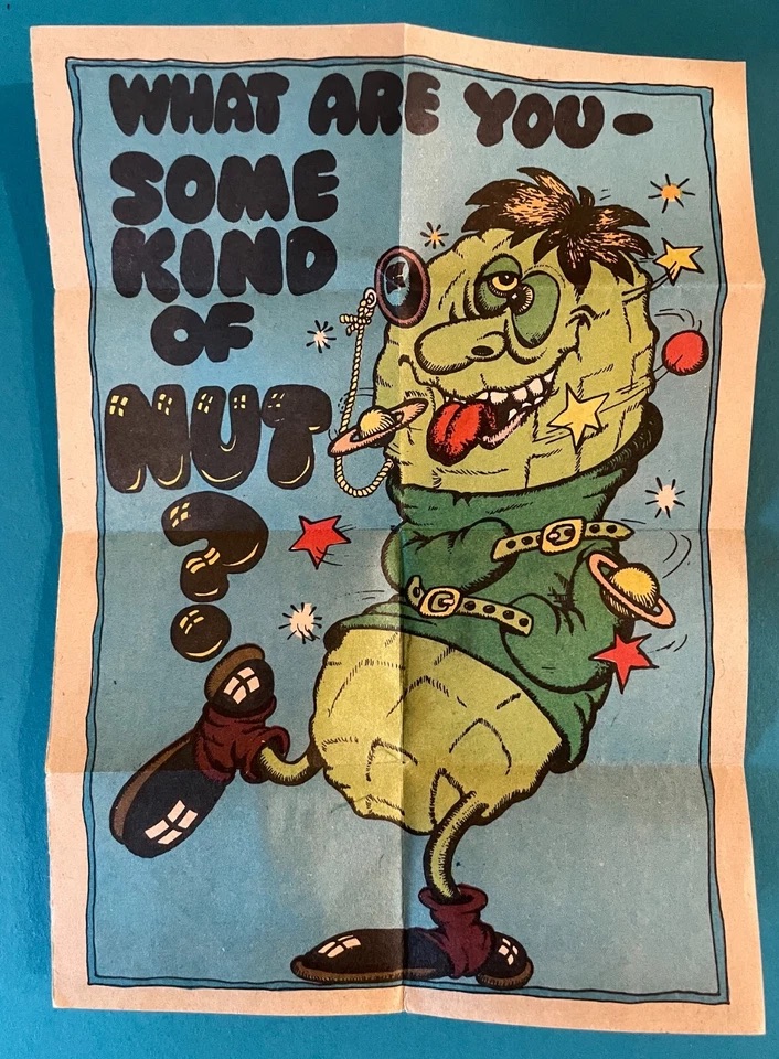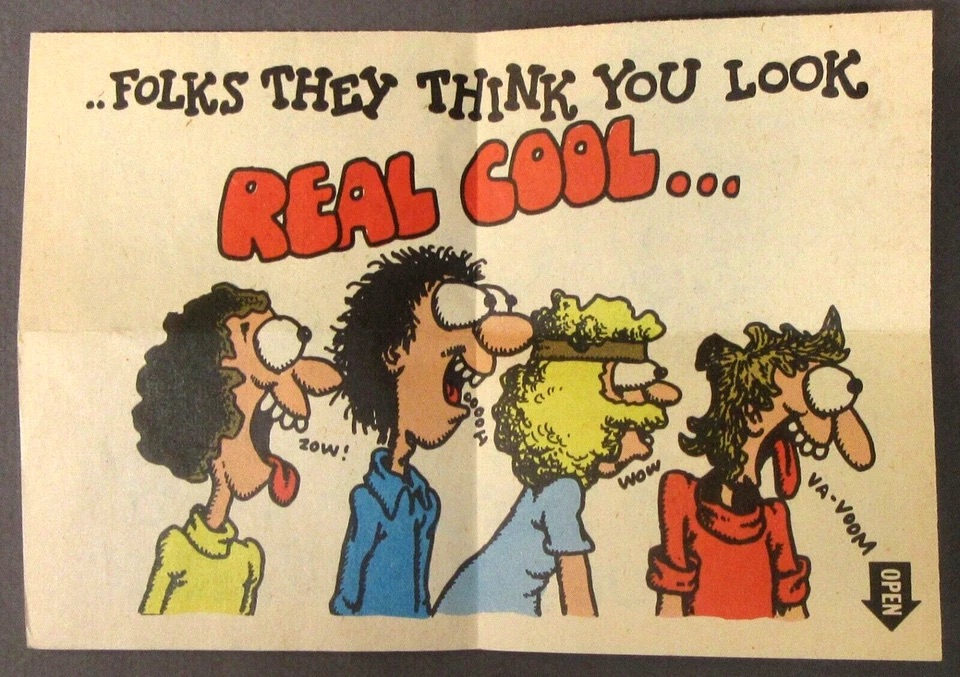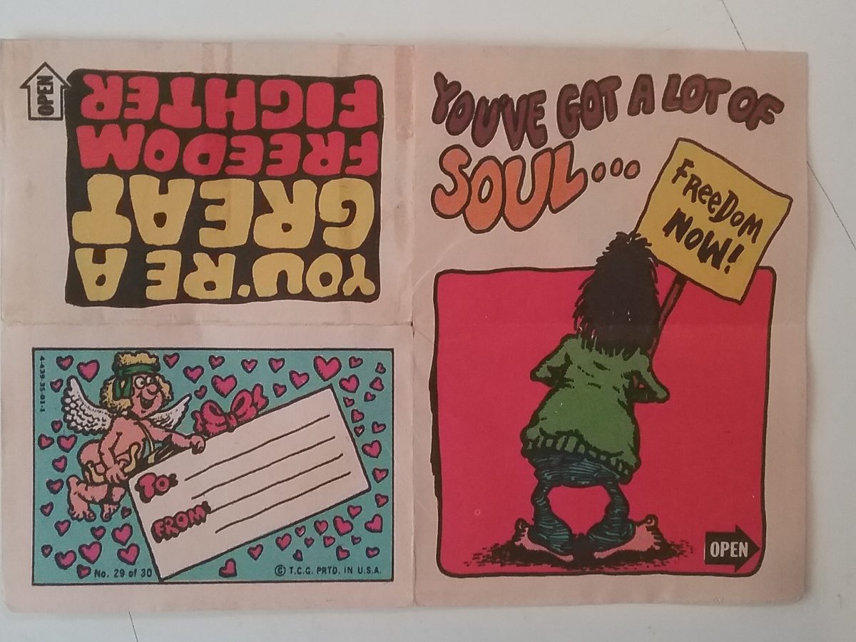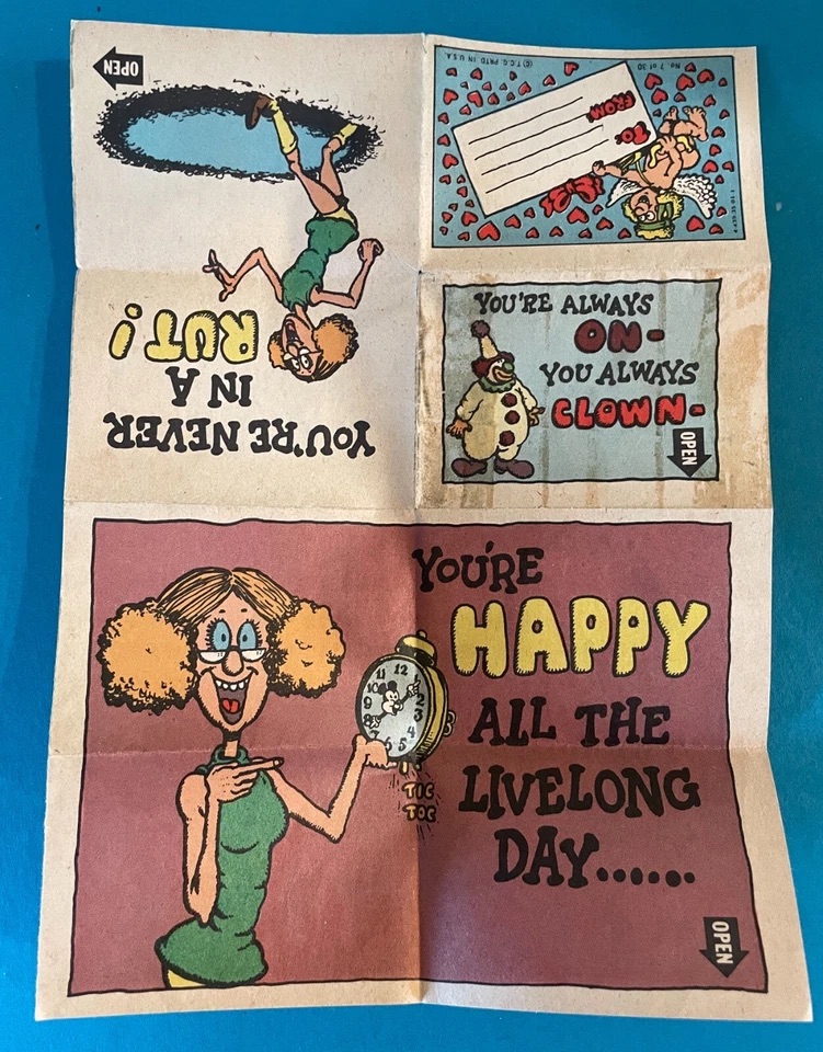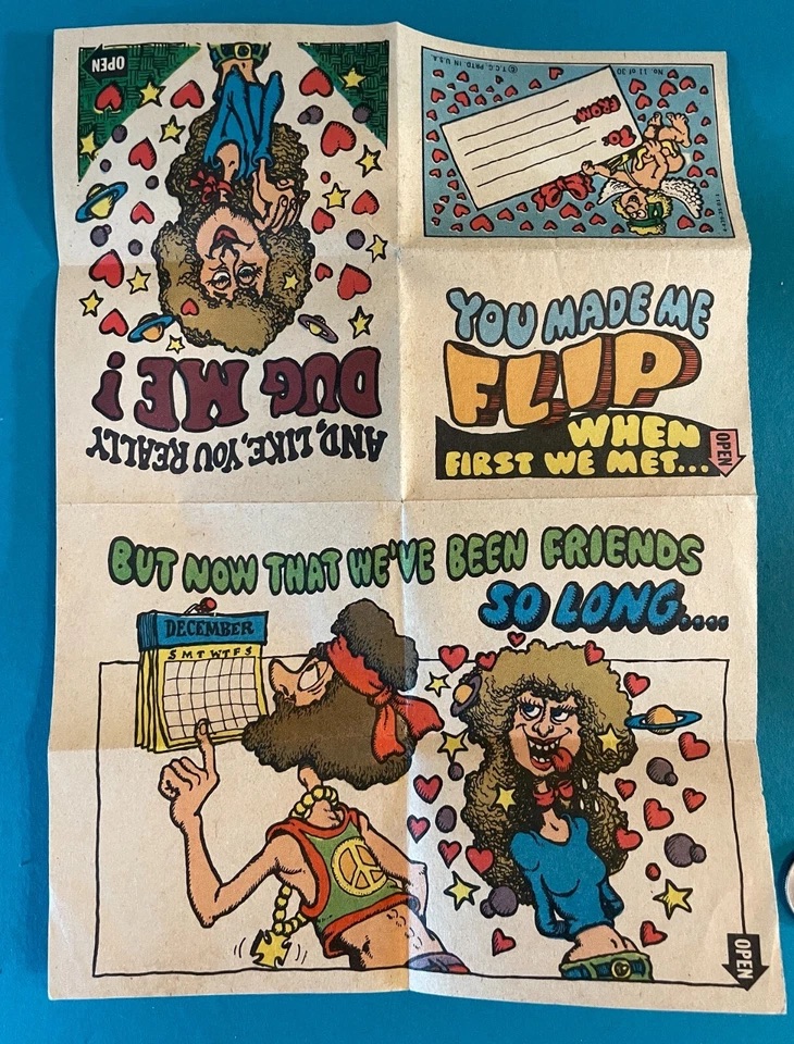 The set of 30 cards lampoon yoga, hippies, fashion, sex and yoga. Sold in the same format as baseball cards, each satirical Valentine’s Day card needed to be unfolded three times to reveal the images and poem.