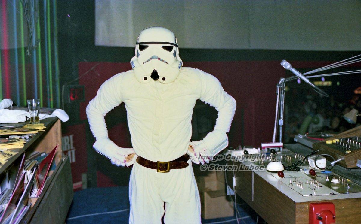 “The momentum of the release of Star Wars just a few months earlier, was STILL a thing back in 1977, by the time Halloween rolled around. The DJ that evening at the club was Larry Davidson, pictured here dressed up as a Jedi Stormtrooper.”