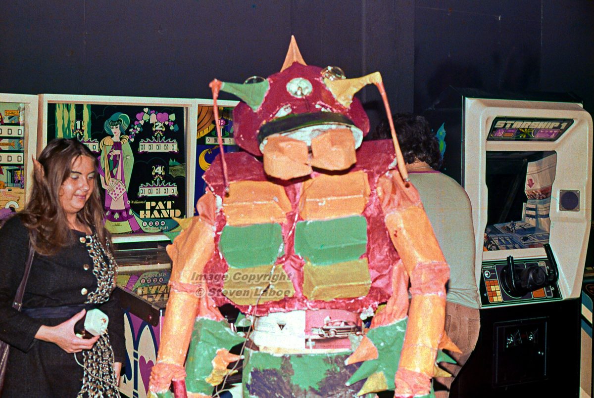 “I’m assuming this was supposed to be some alien being, all decked out in some crazy @$$ colors. It’s impossible to ignore the presence of the classic pinball and video games in the background in this one. Rife Sport, eat your heart out. 😜😛😝😁